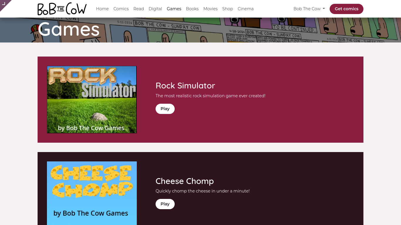 Bob The Cow has games! Play classics such as "Wack-A-Joe", "Mashed Potato Cooking Simulator", "Rock Simulator", and "Cheese Chomp".