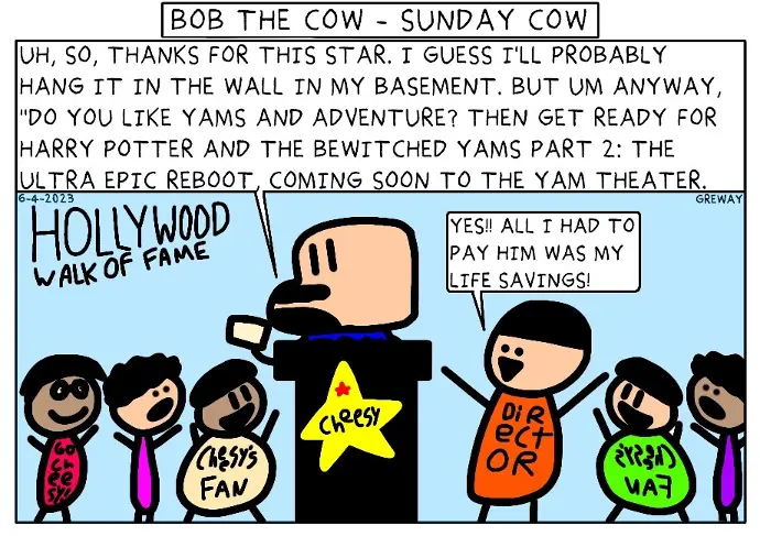Running from May 23 to June 5, there was a Bewitched Yams Bob The Cow comic series in 2023. This series follows the reboot of the Bewitched Yams films, and Cheesy becoming the lead actor.